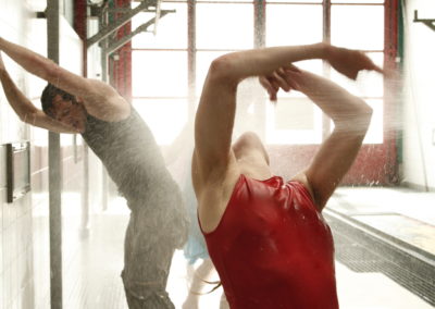 Die Installation Wasserfront bezieht sich auf die Wasserwerfer, welche während Demonstrationen auf heftige Weise gegen die Demonstrierenden eingesetzt werden. In einem ersten Schritt versetzten sich Tänzer/Innen in die Situation der Demonstrierenden und werden durch den Wasserstrahl zu Boden geschleudert und wälzen sich wegen dem Wucht am Boden weiter. Als einziges Element haben sie eine Überlegensdecke dabei um sich zu schützen, aber in Wirklichkeit wird auch diese zerrissen und sie stehen mit blossen Händen da.Mit dieser Installation möchte ich die Ohnmacht gegenüber der gewaltigen Einsätze zum Ausdruck bringen, welche nie aufhört und immerwieder von vorne beginnt, bis zur körperlichen Erschöpfung der « Tänzer/Innen ». Sie interpretieren diese heftige Bewegugn immerwieder aufs Neue bis zur Verzweiflung: …Die Gewalt wird hier durch ein Schlauch dargestellt, welcher in der Installation präsent ist, aber der Betrachter sieht ihn nicht, nur kurz am Anfang des Loops. Die heftige Bewegung kommt immer von links nach rechts. Diese Bildrichtung wird auch durch die 6 Kanal-Toninstallation unterstützt. Die Installation Wasserfront setzt sich zusammen aus drei Projektionen mit peinture animée und zwei Tunnelprojektionen. Die Tonkomposition ist auf die dreier Projektion abgestimmt. Die Installation ist eine Hommage an Neda Agha Sultan, Wiederstandskämpferin für die Freiheit und Gerechtigkeit der Lebenssituation der Frauen im Iran. Sie ist auf tragische Weise an der Demonstration gegen das Mollah Regime am 20 Juni 2009 von der Polizei erschossen worden.